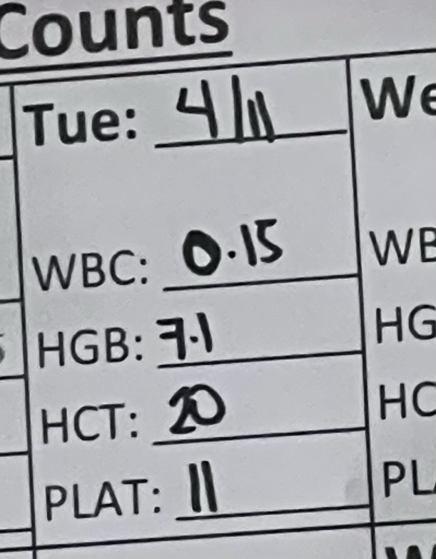I’m hopeful today will be a better tummy day and energy day. No transfusion today. Tomorrow likely to drop under threshold for both hemoglobin and platelet – but today I get a little break. IV and antibiotics only.