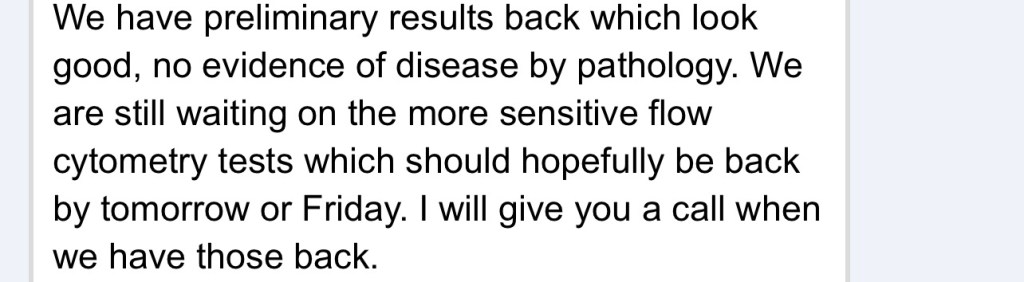 The NP responded on 6/7 with this. But didn’t hear from her Thursday or Friday but she may not have gotten the cytometry tests back yet. Pet Google: Cytometry is the measurement of number and characteristics of cells. Variables that can be measured by cytometric methods include cell size, cell count, cell morphology (shape and structure), cell cycle phase, DNA content, and the existence or absence of specific proteins on the cell surface or in the cytoplasm. And I’m obsessing again.