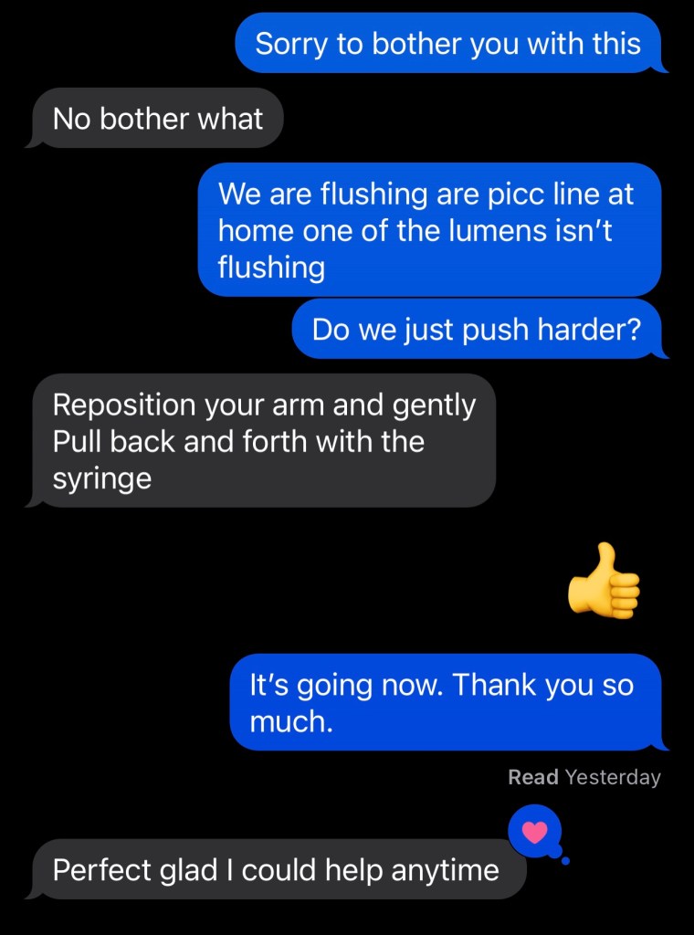 I had a miserable night, nausea and a migraine. S laid down in my bed with me as she watched her iPad and held my hand until I fell asleep. I woke up at 2:56am to her lightly baby snoring. That’s what I call her deep sleep breathing. Even as a baby she would baby snore and it was absolutely the most comforting sound. I made the mistake of skipping my Kytril – bad move. The IV antibiotic amplified all the nausea in one sweep. J couldn’t flush the white lumen on my picc and we both were freaked out. I texted him R and as always she came to my rescue –