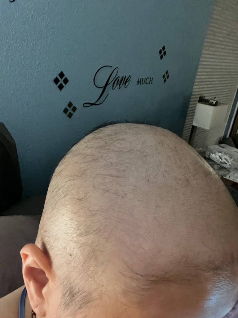 I have reached a plateau with my hair loss. It’s back to the Golem stage again but it’s not making the same mess on my bedsheets and pillow cases. As much as it was jarring to see it was also annoying to deal with. The coconut oil glides on my head and my scalp feels less painful. The desire to move, drink or eat isn’t as prominent – I’m not malnourished – there is still plenty of fat to keep this body fed though my muscle goes first. The hydration today made me feel better but then the IV antibiotics make me feel like garbage.