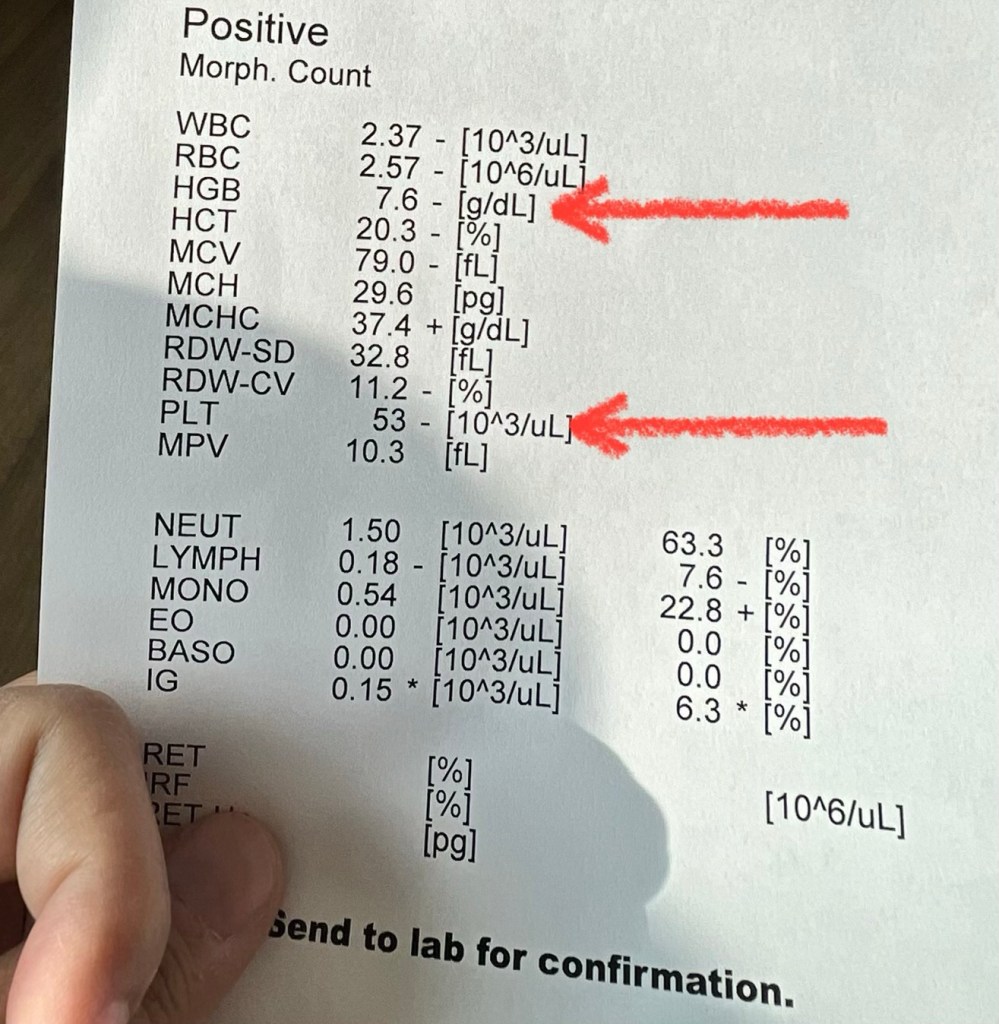 After sitting for weeks at a single digit platelet count I hit 53 today. B asked me how much I think my platelet was I told her I was 17 on Friday so maybe 20? She had a huge smile on her face and said 53! I haven’t been this high since I got out of the hospital. Numbers are just numbers but I’m excited to have some better numbers.
