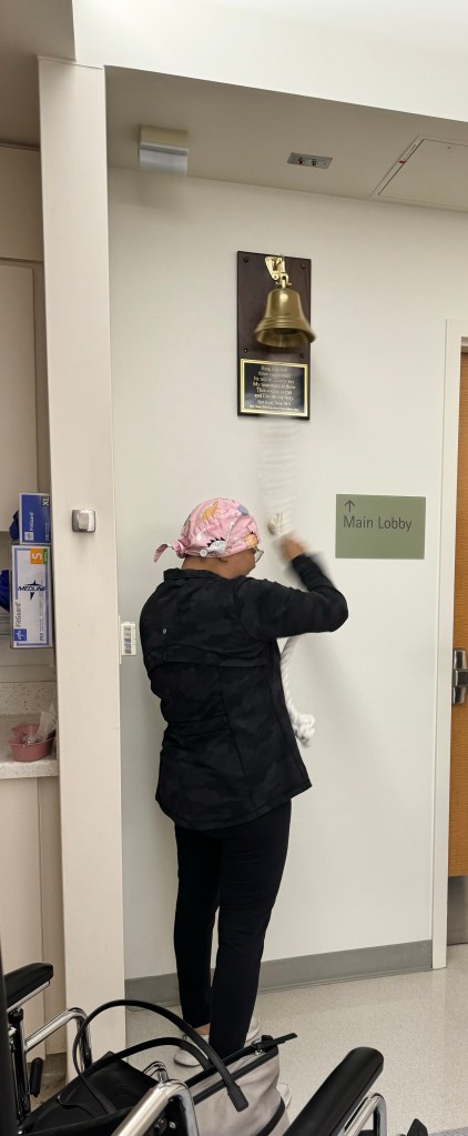 Earlier in the week, I had heard the bell and quietly cried myself to sleep, wishing that was me right then and there. Except I had to wait it wasn’t my time yet I didn’t have the set of stats that supported it. But I still wanted it to be me to be able to have Ste come visit get on a 24 hour trek to see me and take me out of the hospital with some thing that I will never be able to thank her for. I didn’t just ring that bell. I rang the sh*t out of that bell. I yelled and wooted as the bell rang and rang and rang. My heart was so full of love and gratitude not because I got cancer but because of the lessons I’ve learned from cancer. I got a clap out as I was wheeled out of the hospital and as we were leaving the hospital to get on the road. I was relieved and grateful to be going home.
